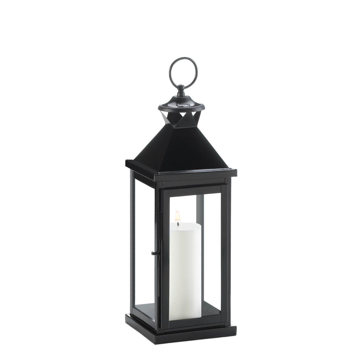 • Create a modern candlelight display with this large metal and glass candle lantern. The lantern features a traditional frame with a square base, glass window panes and a contemporary galvanized metal top. Finished with a metal ring for easy hanging, this decorative metal lantern will make your space look cozy and chic. Place on an end table, coffee table, or a cabinet, mix with other chic decor for a polished finish. Add a flameless candle for a gentle, warm glow.